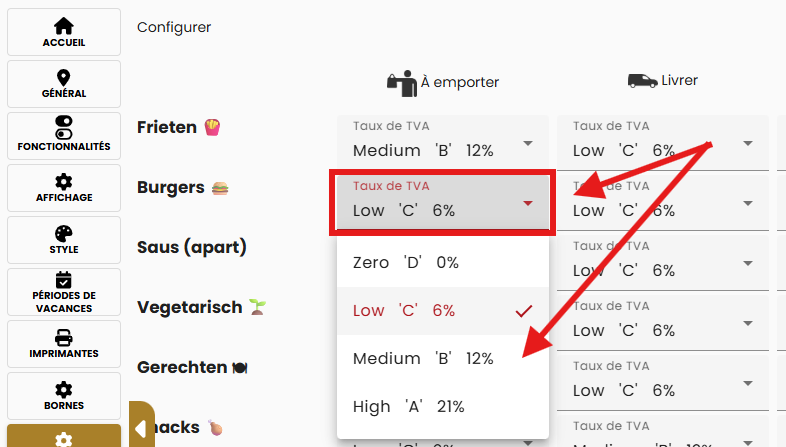 Vous obtiendrez un aperçu de toutes les catégories, avec les taux de TVA fixés pour: