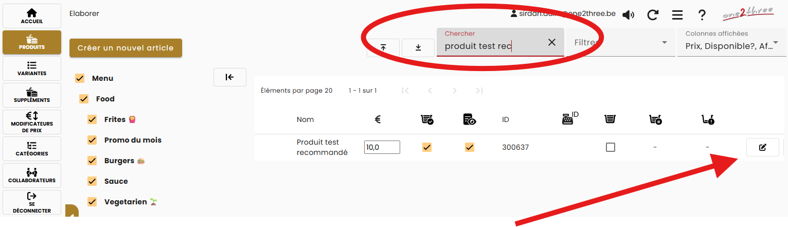- Recherchez le produit que vous voulez recommander et cliquez sur l’icône de modification.