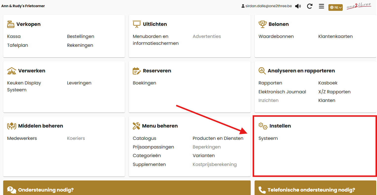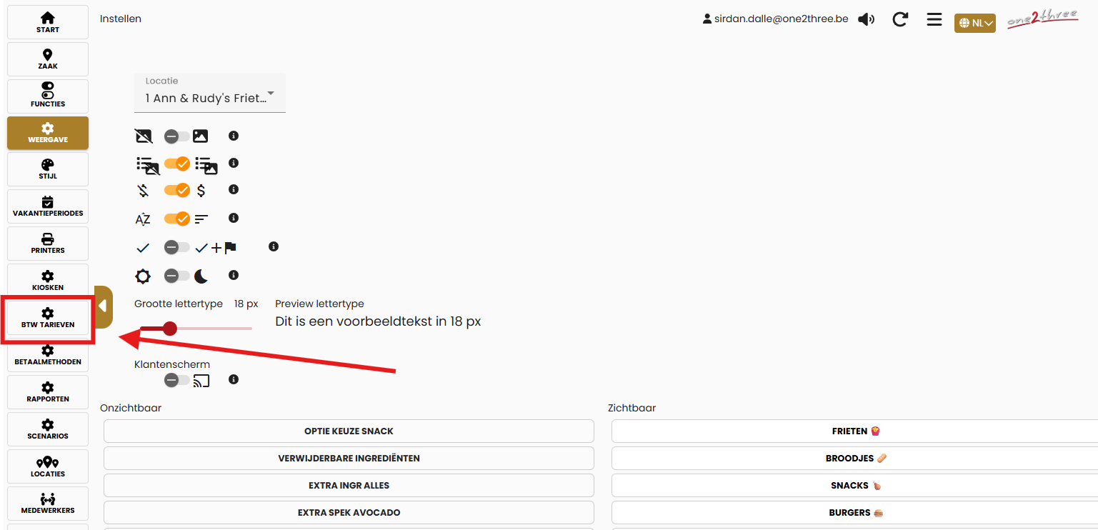 Ga naar one2three dashboard → Instellen → BTW-tarieven
