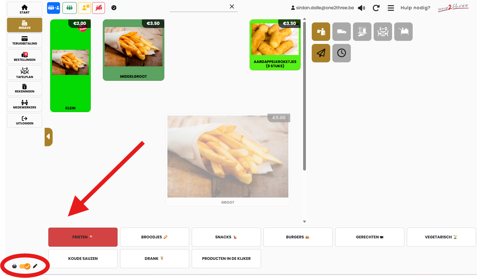 Onderaan links kan je wisselen tussen het winkelmandje en het potlood-icoon.
